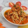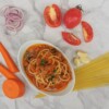 KYLLING, SPAGHETTI, GULROT, RØDLØK, TOMATPURÉ, TOMATER, HJEMMELAGET KYLLINGELAGER, FERSK TYME, FERSK OREGANO, ITALIANSKE TØRKTE KREDDER, SJØSALT, PEPPER